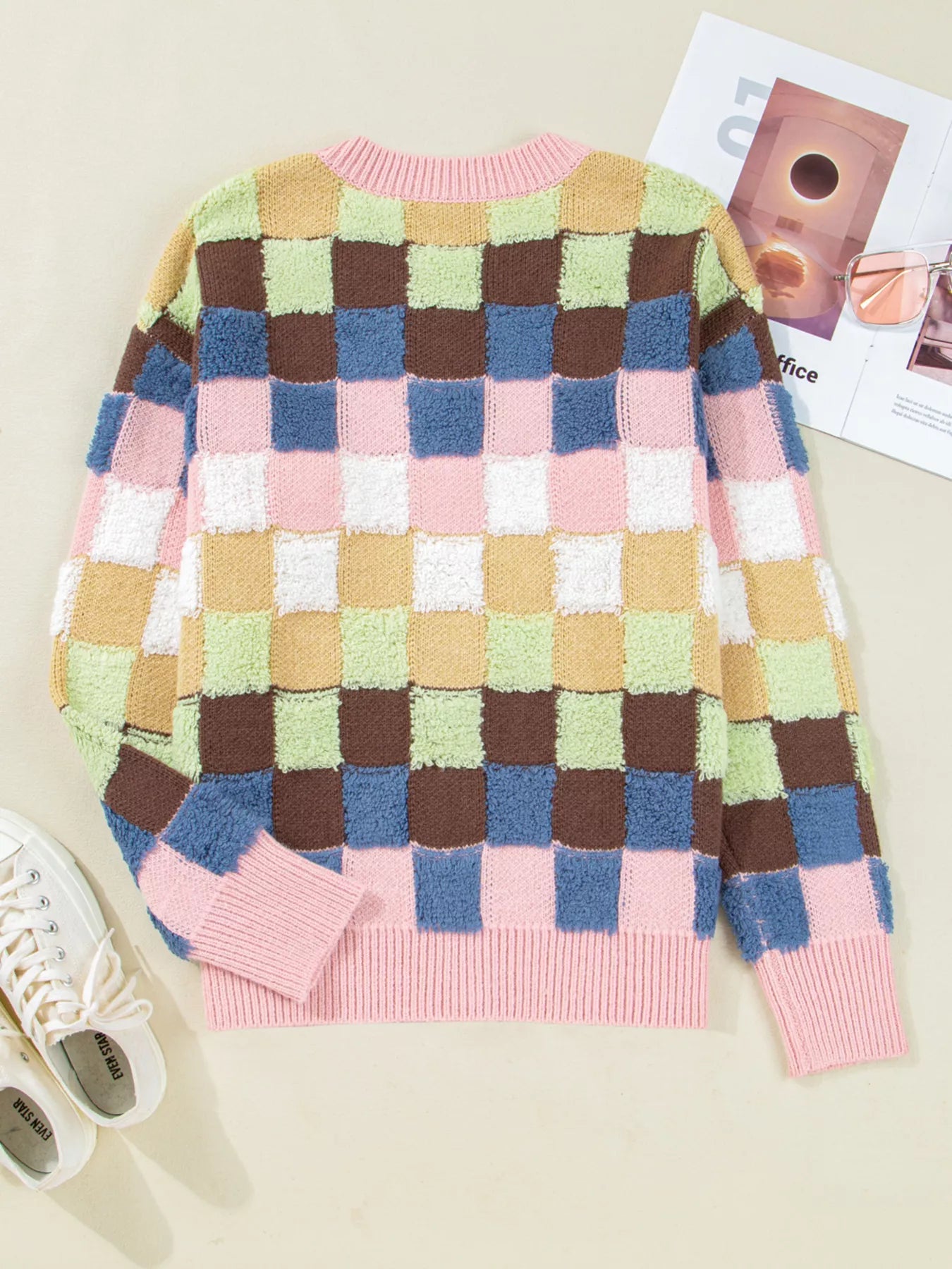 Style this versatile checkered cardigan with high-waisted jeans and white sneakers for casual weekend charm, layer it over fitted basics with midi skirts and ankle boots for creative office elegance, or pair it with matching pastel accessories and ballet flats for sweet feminine looks that transition seamlessly from coffee dates to art gallery visits with whimsical sophistication.