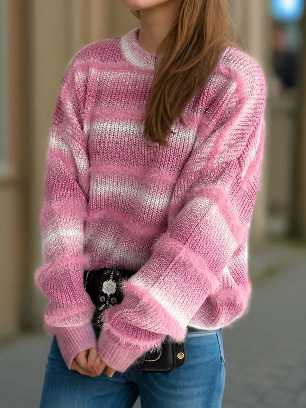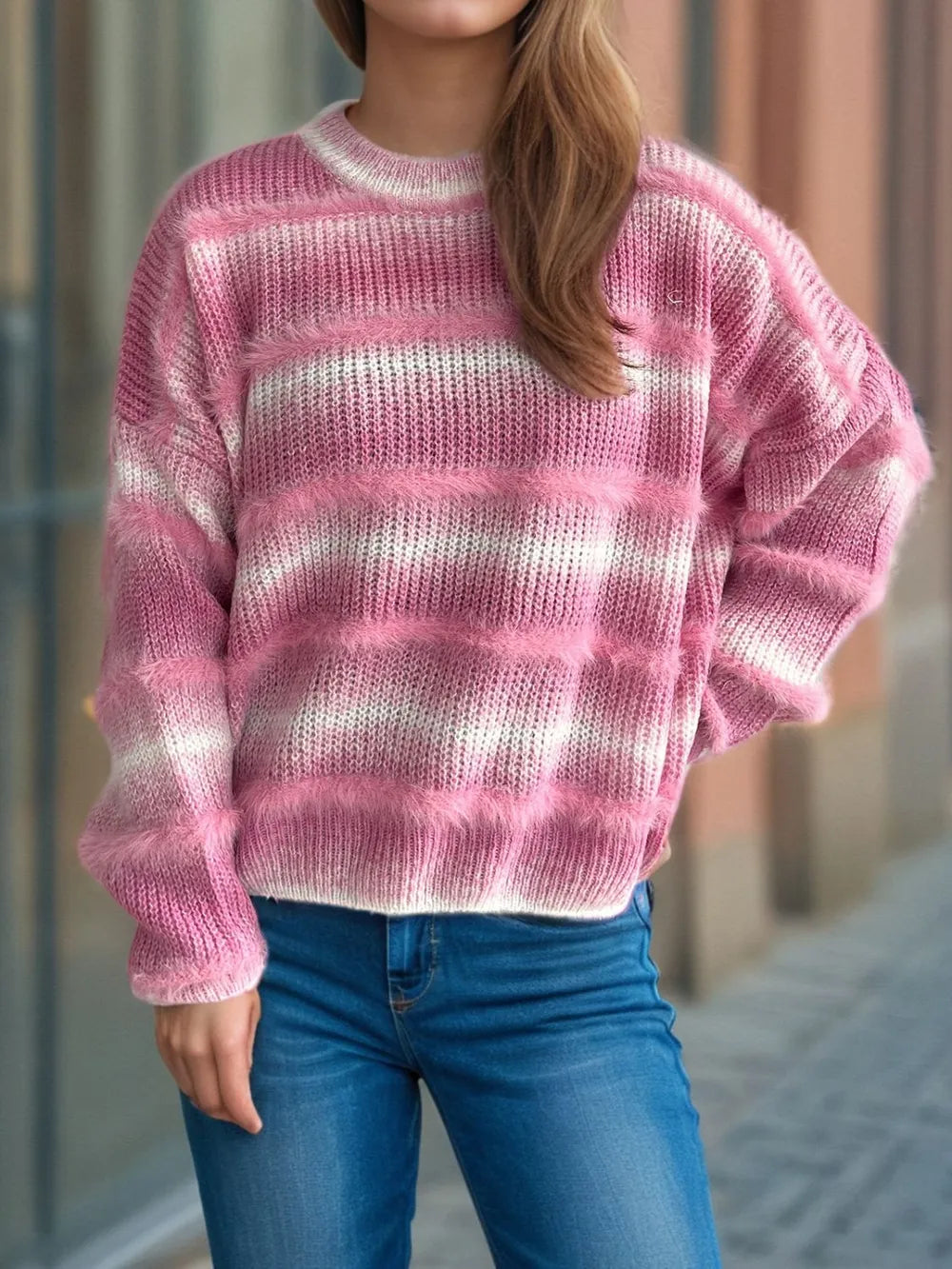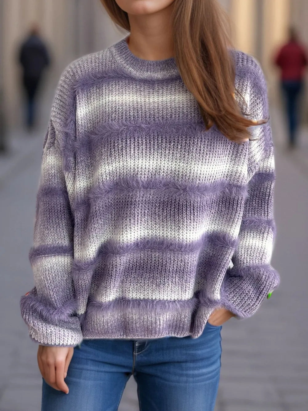 Wrap yourself in cozy sophistication with this striped knit sweater that blends laid-back comfort with modern edge. Featuring an ombré-inspired stripe pattern, the design brings depth and texture to a classic silhouette. The relaxed fit and dropped shoulders create an effortlessly cool look, while the soft knit fabric keeps you warm without feeling bulky.