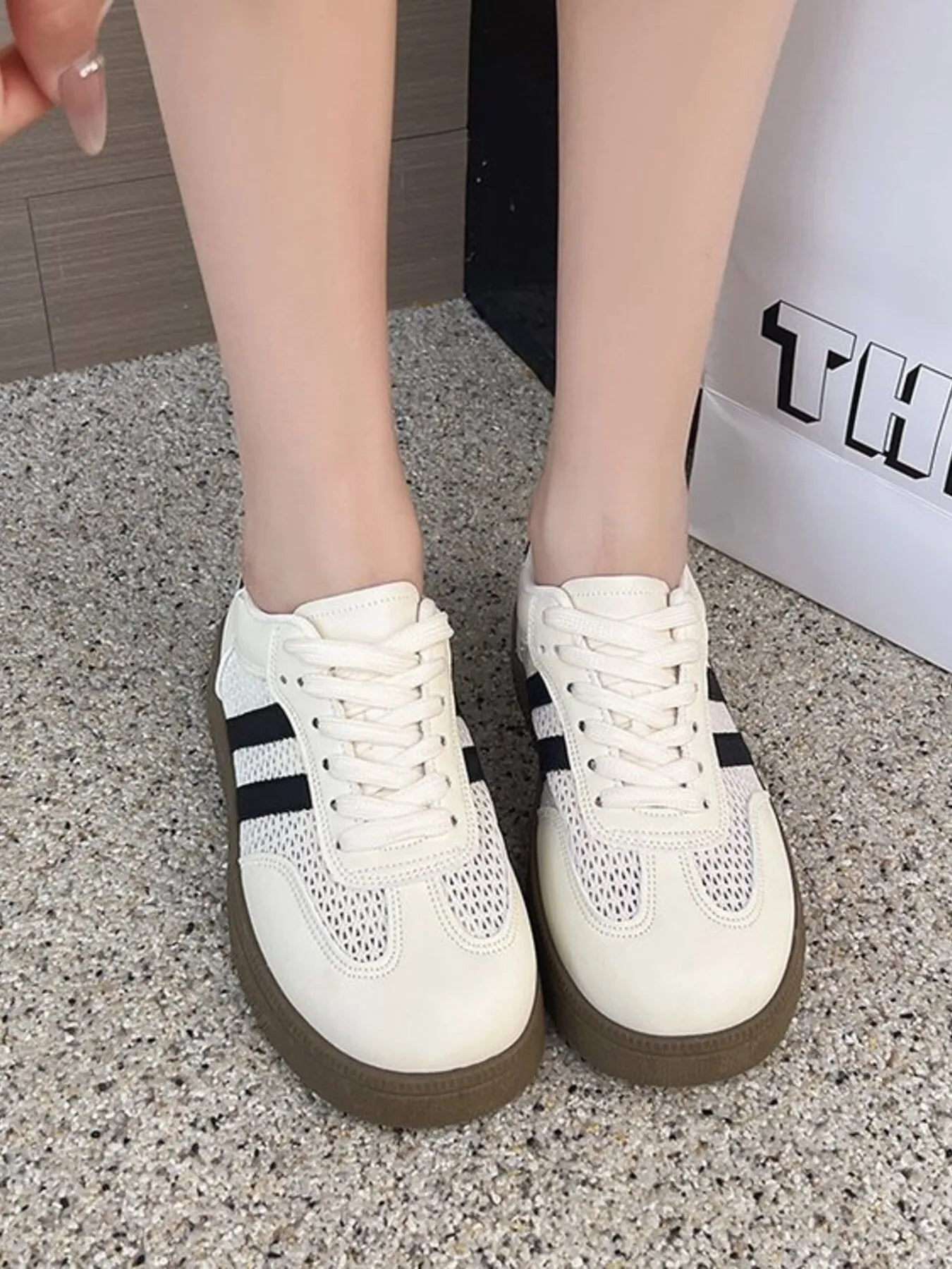 Crafted from a blend of mesh, PU leather, rubber, and PVC for optimal performance and longevity. The mesh panels provide excellent airflow to keep feet comfortable during extended wear while PU leather adds structure and style. The rubber sole with low heel offers reliable traction and slight elevation for a flattering silhouette. These sneakers run true to size and feature quality construction that withstands regular use. The mixed material design ensures flexibility and support where you need it most.