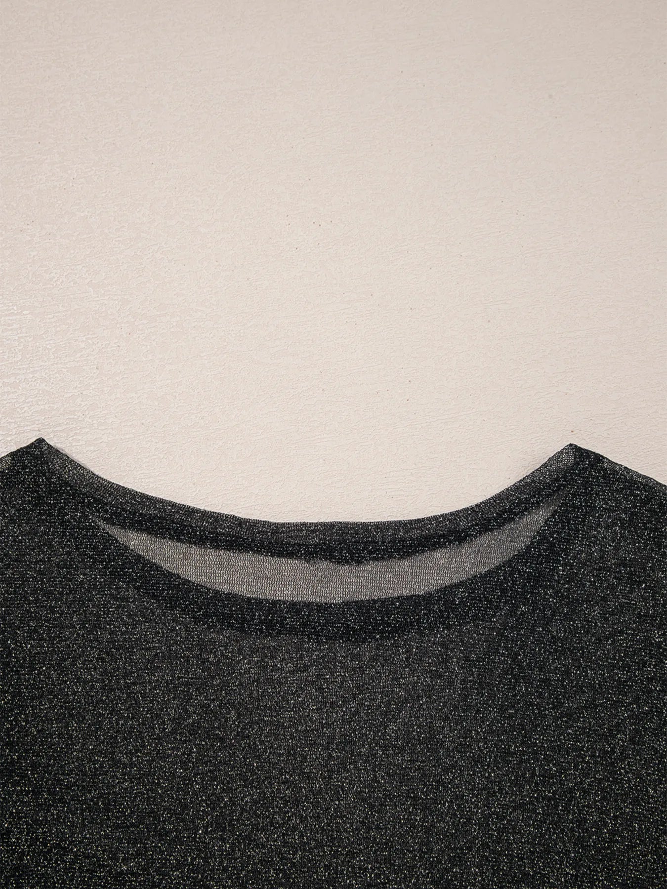 Style this versatile glitter mesh top over a fitted camisole or bralette with high-waisted jeans and heels for elevated evening looks, layer it under a blazer with tailored trousers for sophisticated office-to-dinner styling, or pair it with a sleek midi skirt and ankle boots for date night elegance that's both alluring and refined.
