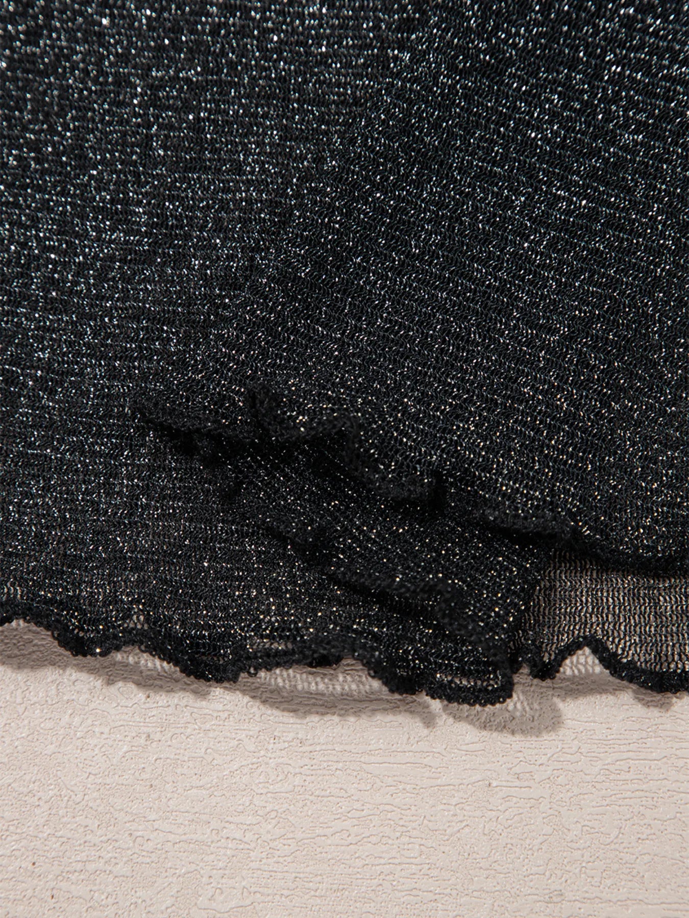 Make a captivating statement with this stunning sheer mesh top that perfectly balances sultry sophistication with everyday wearability through its enchanting glitter-infused fabric and expertly designed silhouette. The alluring semi-sheer construction creates an effortlessly chic layered look, while the classic round neckline and long sleeves offer elegant coverage that's both versatile and flattering. Delicate scalloped trim along the neckline, hem, and cuffs adds a romantic feminine touch that elevates this piece from basic to breathtaking, while the subtle sparkle throughout catches the light beautifully for an instantly glamorous effect.